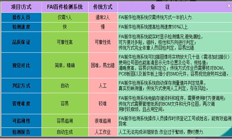 SMT智能首件檢測系統,FAI-520首件檢測儀深圳市百千成電子有限公司  隨著電子產業的蓬勃發展,今天,中國已經成為世界的工廠。電子制造企業的生產效率,品質控制和成本高低決定著企業的競爭力,也決定著企業贏得客戶訂單的能力。電子產品的高度集成化,貼片元件的尺寸及PCBA板的密度達到了前所未有的程度,產品更新換代的速度也越來越快,多機種,小批量,頻繁換線越來越挑戰工廠的制造能力。高速貼片機等設備提升了工廠的生產能力,但是在SMT首件確認環節,大多數工廠卻依然停留在非常落后的人工確認階段。首件確認已經成為SMT生產的瓶頸!目前SMT首件確認通常為兩個作業員配合操作,人工對照紙質BOM清單,CAD位置圖和首件板,同時還要進行元件的量測,誤差計算、對錯判斷和記錄等工作。整個過程耗時較長,導致貼片機使用效率降低,甚至造成停線等待。首件確認環節也過多地占用了人力成本,導致工廠成本上升。另外人工確認缺乏有效的管控,不可避免的人為失誤加大了首件檢測的風險,可能造成產品批量返工。針對此難題,深圳華普通用科技有限公司聯合美國陽升測試設備有限公司,成功推出了SMT智能首件檢測系統FAI-520,在實現品質提升的同時,還可以減少一半人員,提高一倍效率!